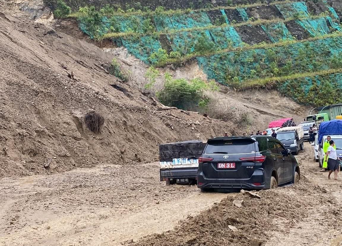 Material tanah bercampur lumpur menutup badan jalan dan menyebabkan arus lalu lintas dari arah Palu menuju Kabupaten Parigi Moutong maupun sebaliknya terhambat. Sejumlah kendaraan roda dua maupun roda empat tampak mengular panjang di lokasi kejadian.